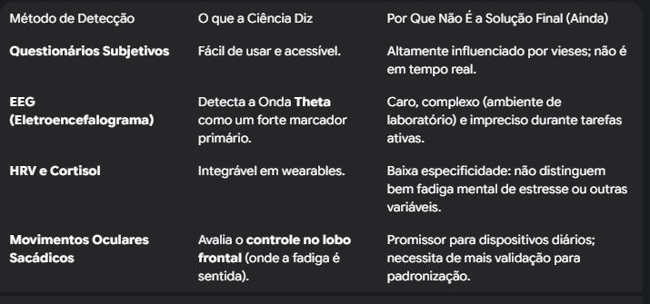 A detecção da fadiga mental é a chave para a prevenção, mas os métodos atuais são falhos. O estudo de Kunasegaran et al. (2023) faz uma crítica contundente à dependência dos Questionários de Autorrelato, que são subjetivos e não conseguem medir as rápidas flutuações do nosso estado mental.