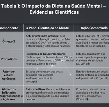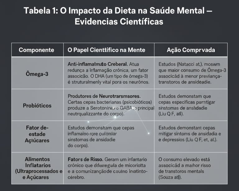 Base Científica e Referências Citadas (Eixo Microbiota e Ansiedade): Tese do Eixo Microbiota-Cérebro: Estudos de Revisão (Liang et al., 2018; Zanetti, 2024); Ômega-3 e Inflamação: Natacci et al. (2018), Avancini et al. (2021), Cortes et al. (2013); Probióticos e Neurotransmissores: Ensaios Clínicos (Liu Q F, et al. 2023; Tian P, et al. 2023). Impacto de Alimentos Inflamatórios: Pesquisas de Pamplona (2006) e Souza et al. (2024).
